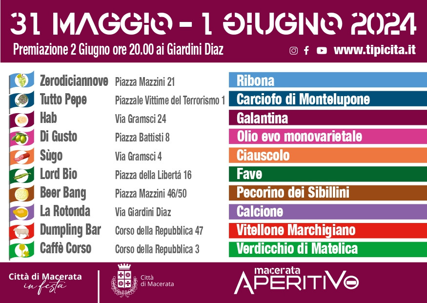 Domenica 2 giugno evento di premiazione nell’ambito di Città di Macerata in Festa, sul palco dei Giardini Diaz, a partire dalle ore 20.00 con la conduzione della food editor Ilaria Cappellacci che farà parte della giuria insieme all’active girl Lorena Bega, Nadia Stacchiotti con i suoi “Racconti di Marche”, Deborah Iannacci alias Trippadvisor, Juliana de Brito di Worderful Marche e Alessandro Axel Biti, Ambassador dei borghi più belli d’Italia.